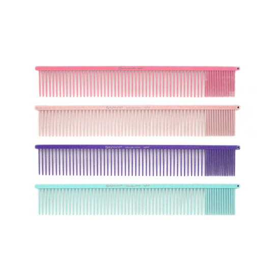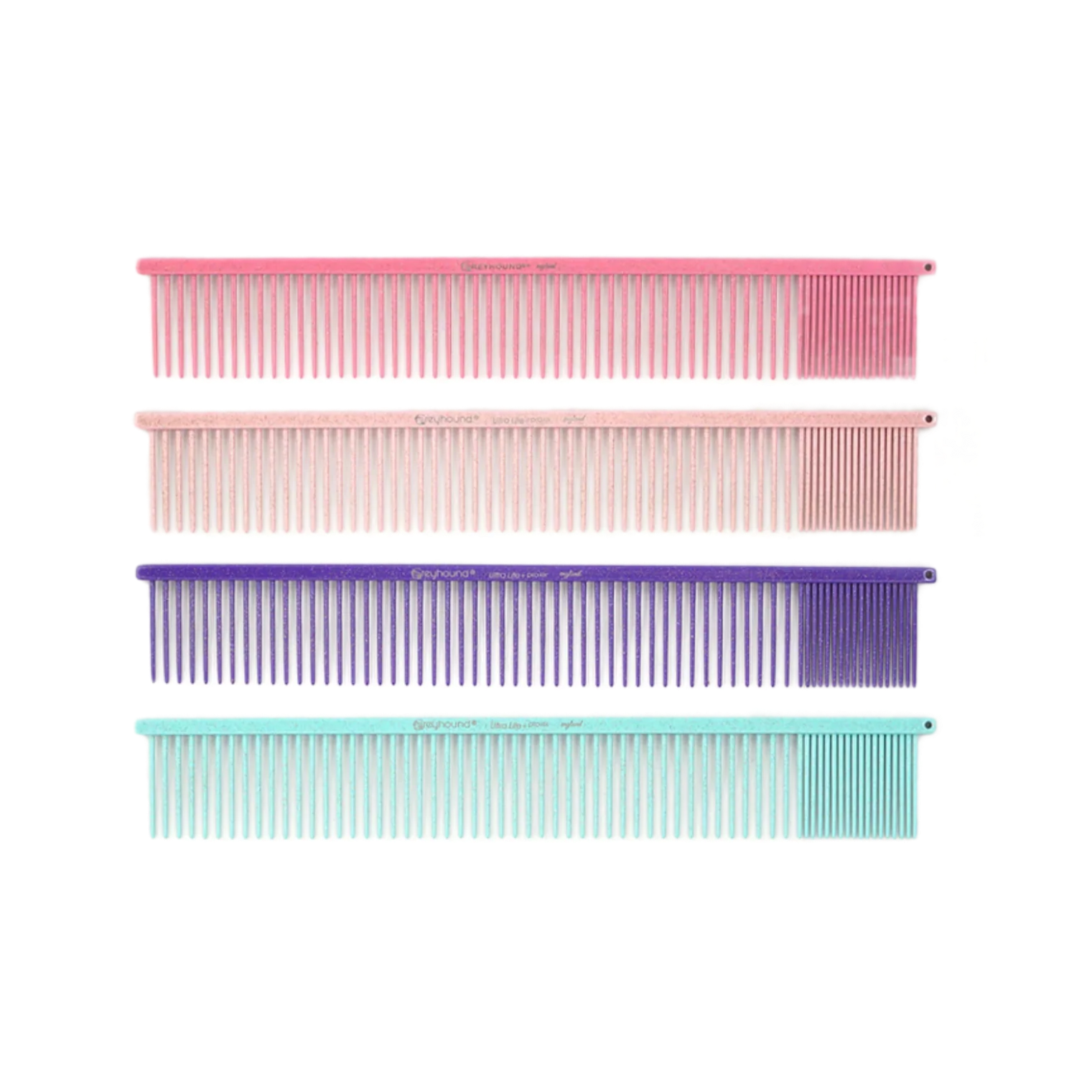 Greyhound Combs Ultra Lite+ (puddelkam) har et flot udseende og er velegnet til lang pels! Greyhound Combs Ultra Lite+ (puddelkam) har en speciel antistatisk belægning (overflade), der gør kammen helt speciel at rede med. Greyhound Combs Ultra Lite+ (puddelkam) glider let gennem hundens pels, og den ligger godt i hånden, når man reder og puster på samme tid. Greyhound Combs Ultra Lite+ (puddelkam) er lavet af højeste kvalitet, hvor der ikke er gået på kompromis nogen steder for at opnå et billigere produkt. Greyhound Combs Ultra Lite+ (puddelkam) er meget velegnet til alle langhårede racer, hvor 2-i-1-funktionen med ekstra tætte tænder er særligt effektiv til at fjerne små filterknuder i pelsen. Greyhound Combs Ultra Lite+ (puddelkam) er velegnet til både hverdagspleje og hundeudstillinger. Greyhound Combs Ultra Lite+ (puddelkam) føles både lidt blød og ru, hvilket betyder, at kammen hverken føles kold eller glider i hånden. Greyhound Combs Ultra Lite+ (Pudelkammen) har vist sig at være meget populær blandt professionelle groomere og hundefrisører, hvor alle har deres egen unikke yndlingsfarve.