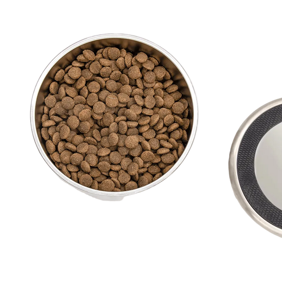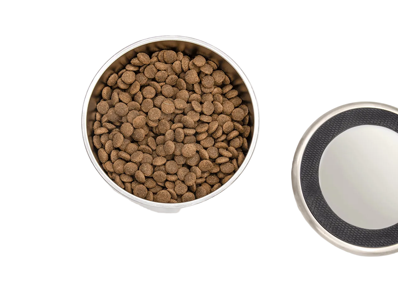 Den kraftige, rundformede gummiring i bunden gør skålen skrid- og støjsikker. Den glider ikke rundt, selv når hunden spiser ivrigt, og beskytter samtidig gulvet mod ridser.