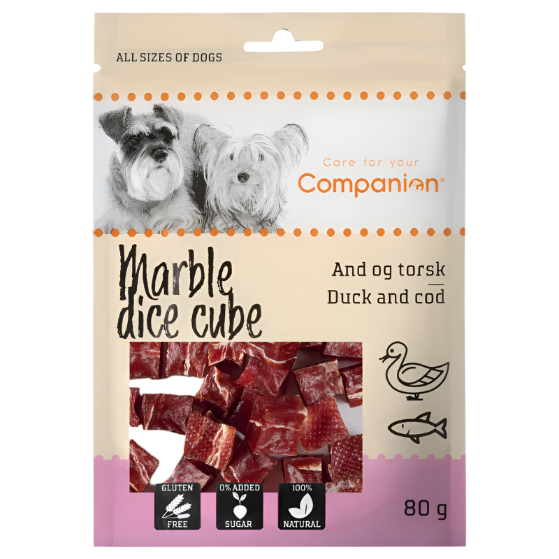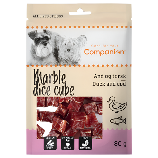 Companion Marble Dice Cubes, en lækker godbid med en fristende blanding af and og torsk. Med hele 92% and og yderligere 2% torsk er disse terninger fyldt med rig smag og sund næring, som hunde elsker. Fremstillet med omhu indeholder de også 3% kyllingebrusk, hvilket sikrer en velafbalanceret smagsprofil, der får din hund til at bede om mere.