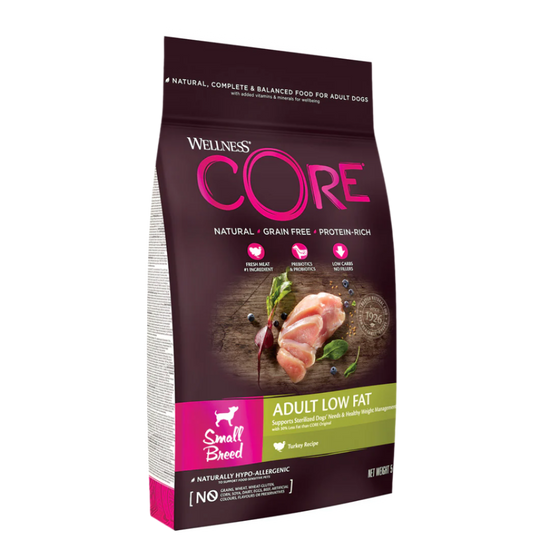 Wellness CORE Small Breed Low Fat indeholder kun ingredienser af den højeste kvalitet og giver din hund, alt hvad den har brug for. Wellness CORE Small Breed Low Fat sikrer essentiel ernæring i en minimalt forarbejdet form, som din hund vil elske.