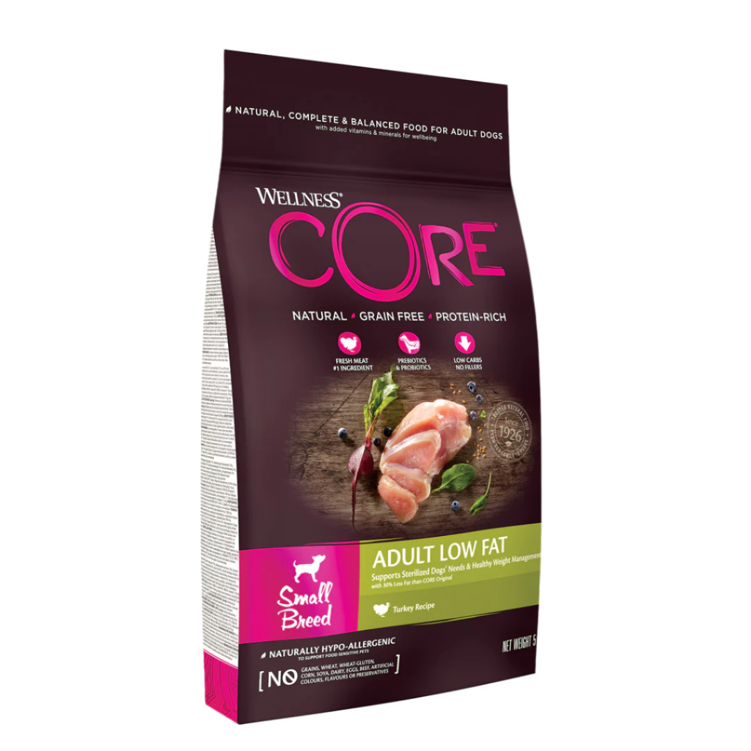 Wellness CORE Small Breed Low Fat er et naturligt kornfrit foder, der sikrer din hund kvalitetsernæring uden kunstige ingredienser eller tilsætningsstoffer, der kan være usunde for din hund. Wellness CORE Small Breed Low Fat er rig på smag og øger accepten hos hunden.