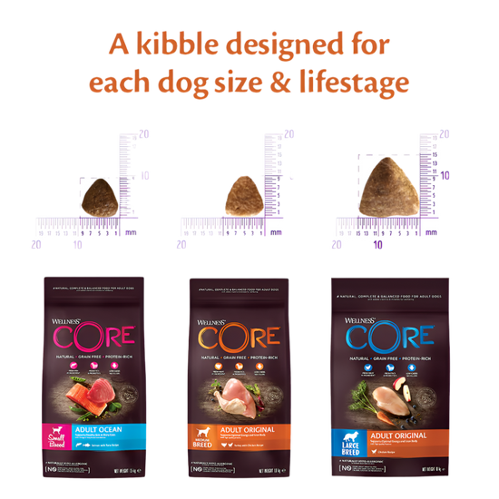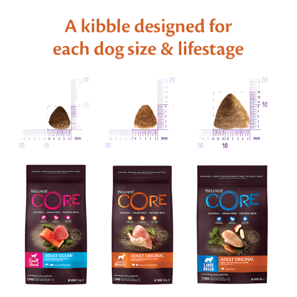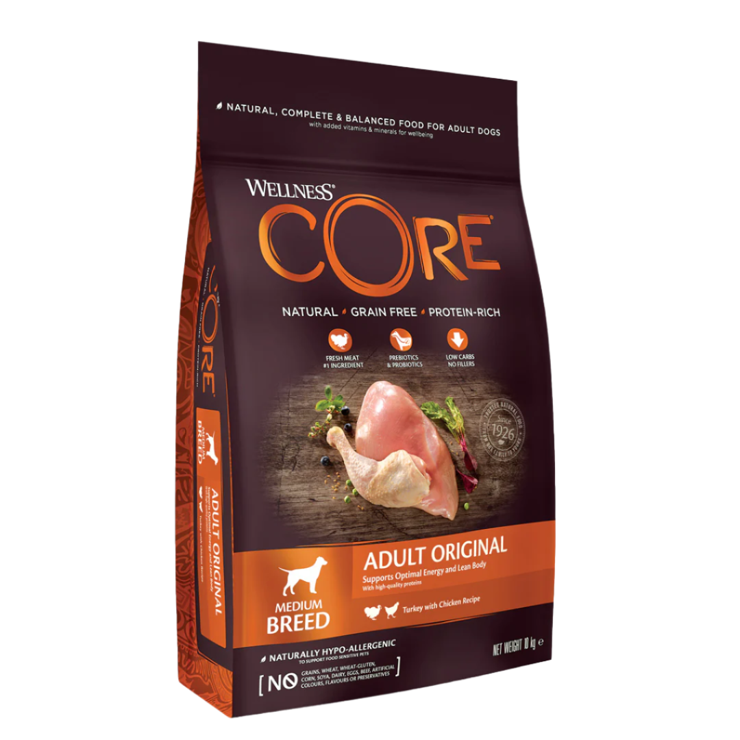 Wellness CORE Medium Breed Adult indeholder 53% proteiningredienser med ægte kalkun som den primære ingrediens, der naturligt understøtter sund energi og stærke muskler.