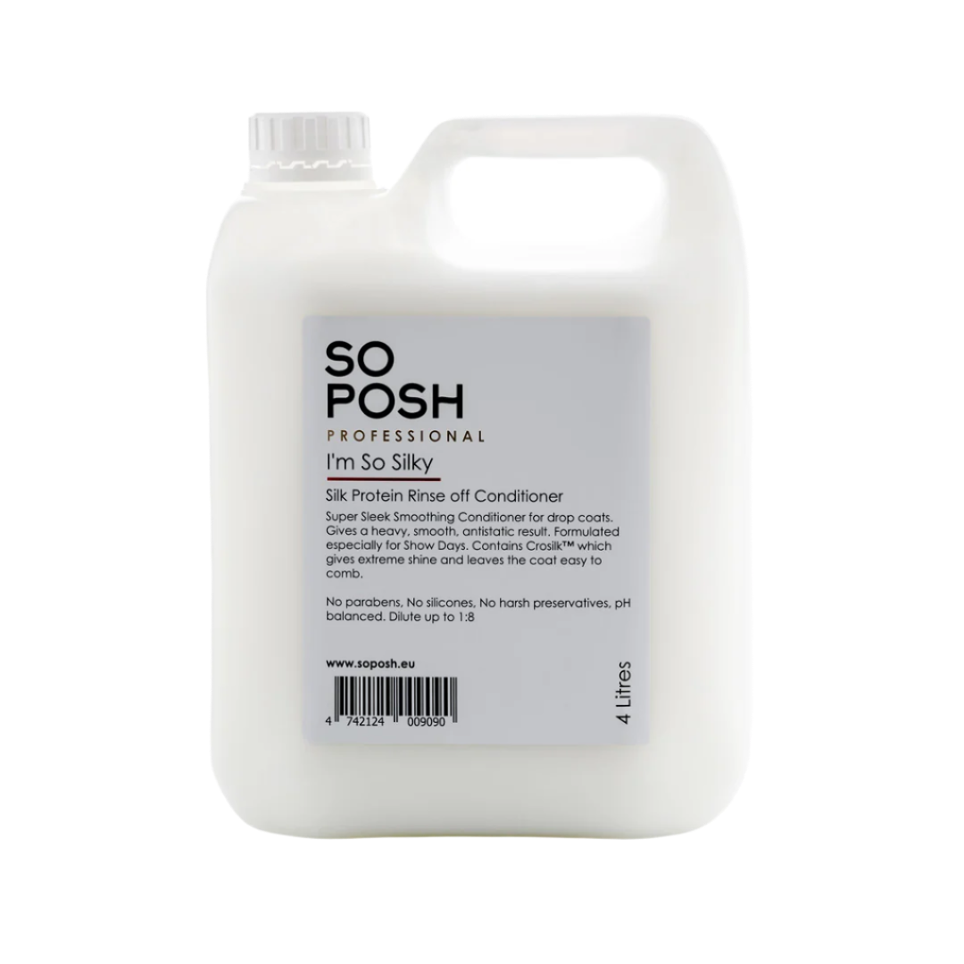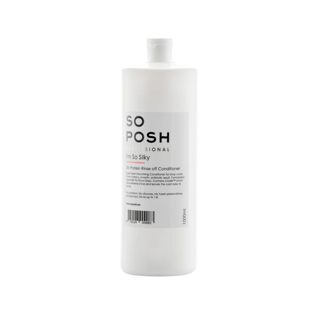 I'm So Silky Rinse-off Conditioner giver en smuk glans og et kraftigt, blødt og antistatisk resultat. Udviklet specielt til når pelsen skal være ekstra fin, for eksempel til en udstilling, men også til hverdagsbrug.