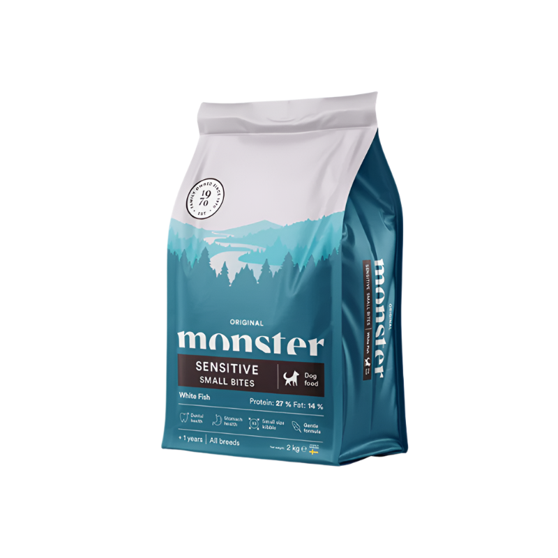 Hvidfisk (21 %), hvidfiskmel (21 %), havre, søde kartofler, kartoffelflager, fiskeolie (6,8 %), sukkerroefibre (2,4 %), hydrolyseret hvidfiskprotein (2 %), solsikkeolie (1 %), mineraler (med natriumhexametaphosphat* 0,32 %), tørret bryggergær, hørfrø, fructooligosaccharider (2500 mg/kg), tang, kikærter, æble, gulerod, tomat, yucca schidigera, lucerne, hyben, morgenfrue, europæisk blåbær, tyttebær, kanel, kamille, anis, fennikel, pebermynte, tranebær, blåbær, spirulina, appelsiner, pærer, morbær, persille. *mineral til reduktion af tandsten.
