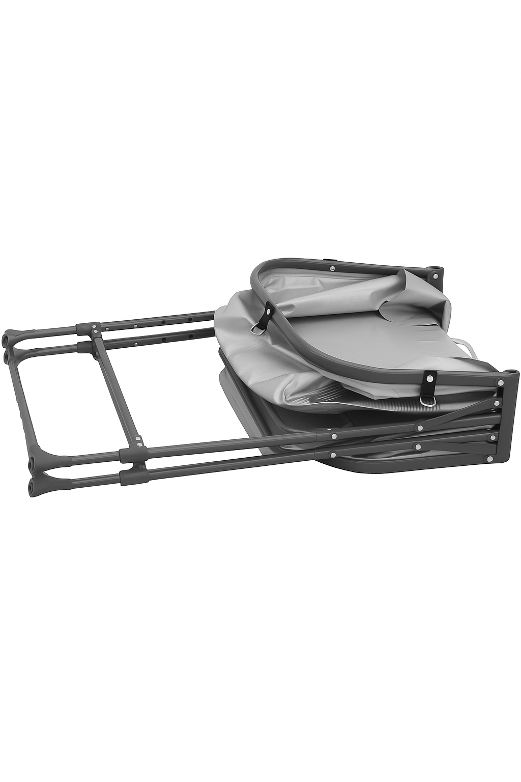 Kompakt badekar: Kan foldes ud og sammen med én hånd takket være den lette konstruktion og den patenterede foldemekanisme. Tørres blot af og foldes sammen ved at trække i håndtaget i midten – så det ikke fylder ret meget. Benene kan nemt afmonteres for at spare endnu mere plads under opbevaring og transport.
