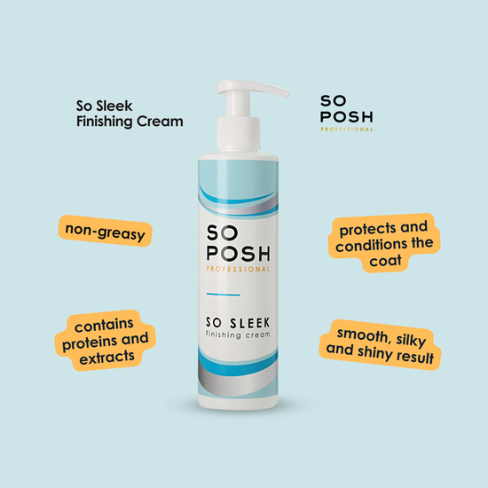 Tilføj lidt So Sleek til fingrene og spred det i dine håndflader og kør over pelsen, børst gennem pelsen og føntør pelsen med en børste for at glatte den ud.