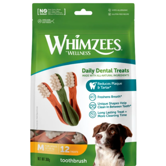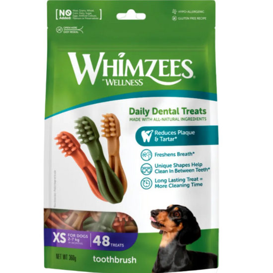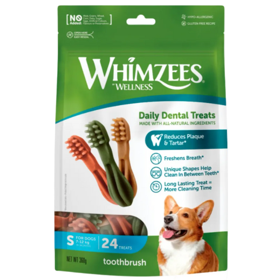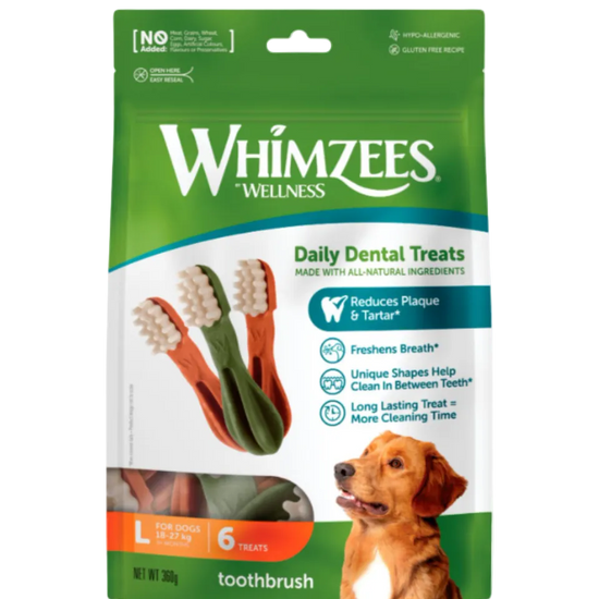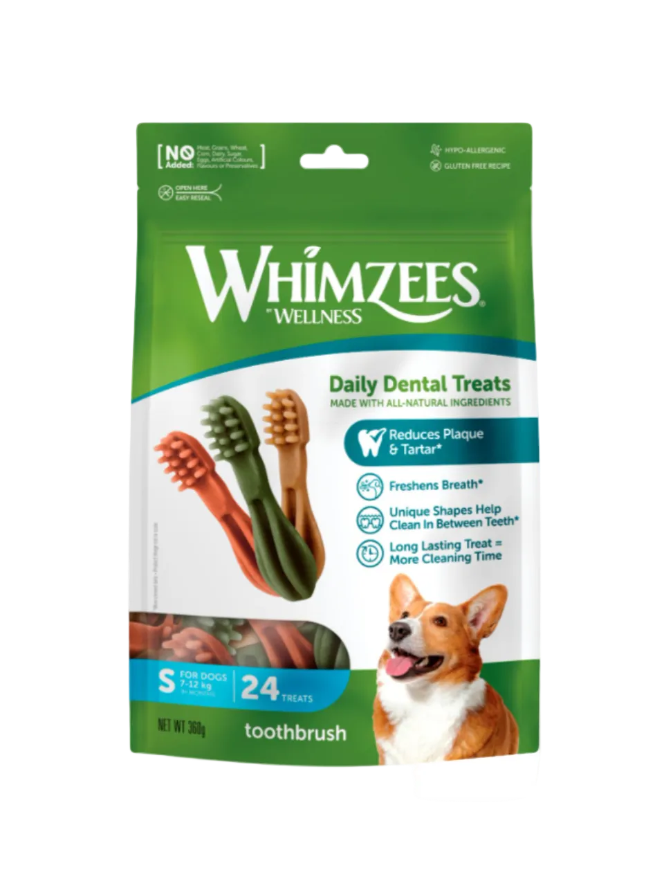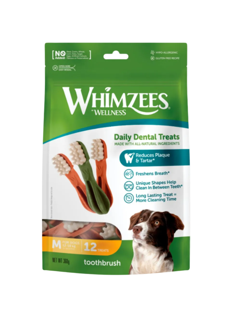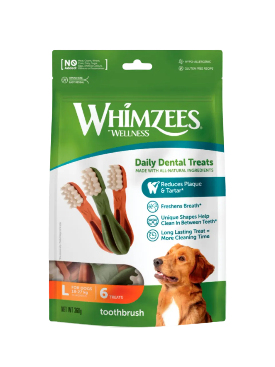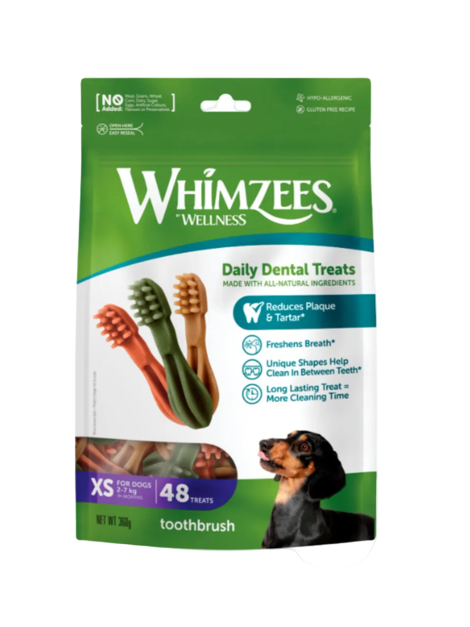 Disse underholdende og effektive "tandbørste" godbidder er sammensat af blot seks nøgleingredienser og bidrager til at fjerne plak, tandsten og reducere de bakterier, der forårsager dårlig ånde. Tandbørsterne har gennemgået videnskabelige tests og er blevet certificeret af VOHC for deres evne til at mindske tandsten og plak hos hunde.
